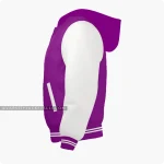 Indulge in the essence of classiness and royalty with our purple and off white varsity jacket! What makes it royal and grabs attention is the hoodie-style and colors. Purple is the color of royalty and empowerment mixed with off white it is outstanding. Crafted with high-quality wool it assures comfortability and durability that will stay for generations. It’s a rough and tough jacket for all occasions, be it casual or semi-formal. Let your style speak volumes with this purple and off white varsity jacket for men and women. Customize these purple varsity jackets according to your collar style (byron or regular), size, fabric (satin or leather), and color combination!