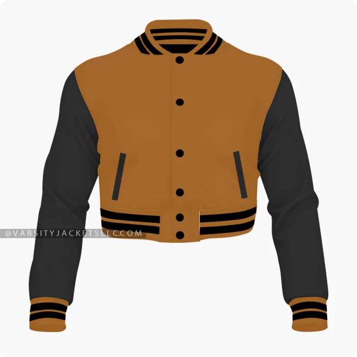 Brown And Black Cropped Varsity Letterman Jacket For Women