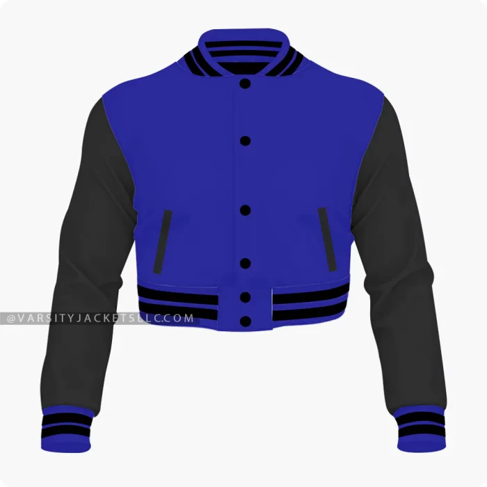 Dark Blue And Black Cropped Varsity Jacket For Women