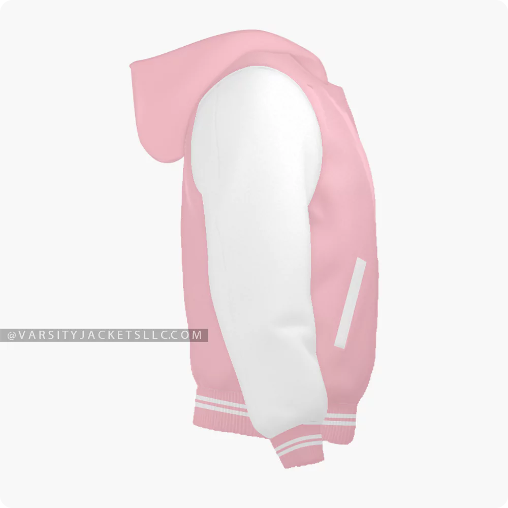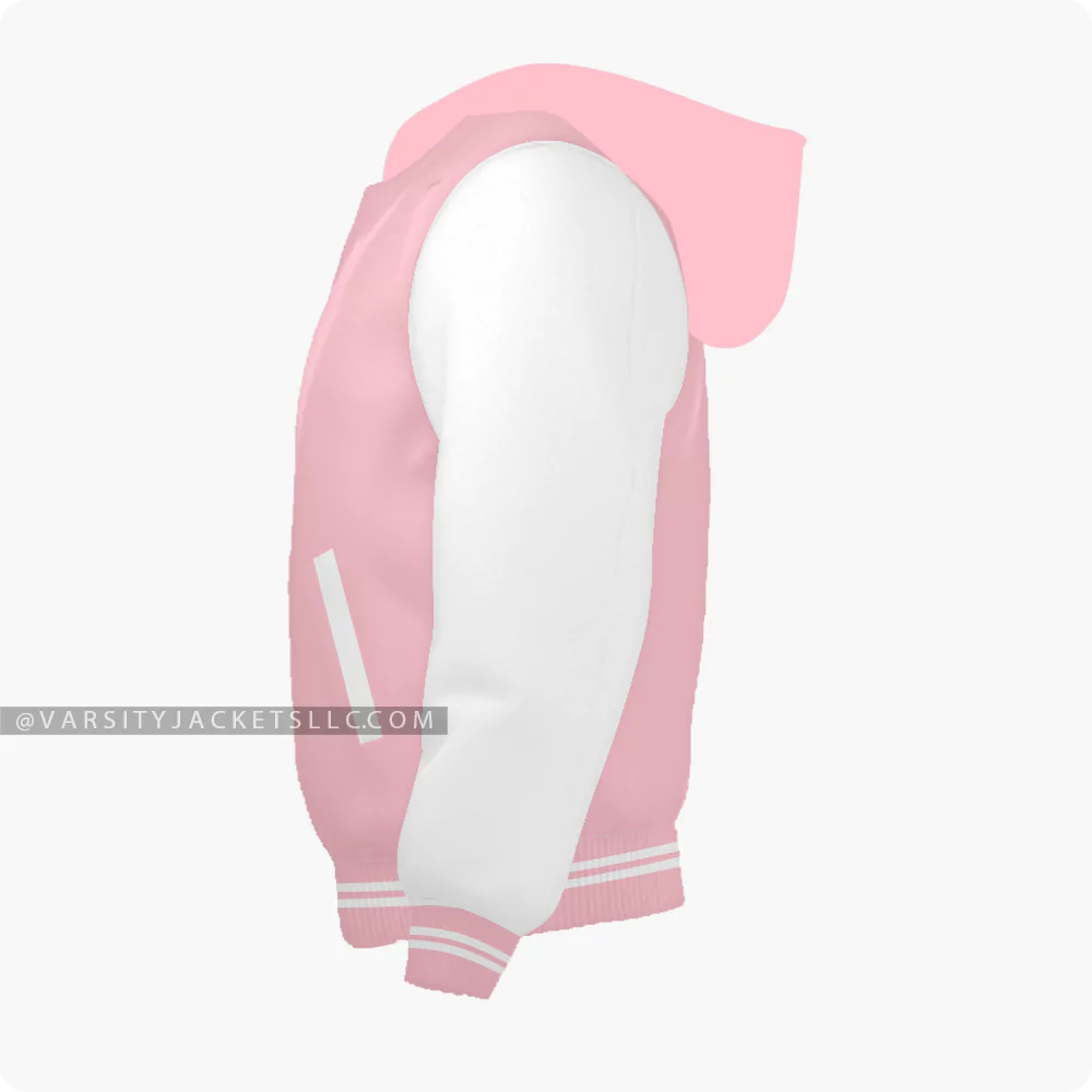 Experience your individuality and express it with this pink and white varsity jacket for men and women. Looking for a cute pinky jacket that doesn’t look too feminine? Then this combo will be your best bet! It is a masterpiece that won’t go out of fashion, especially with that hoodie-style collar. It’s time to celebrate the fusion of tradition and contemporary style by wearing something that speaks volumes about quality and design. Made from premium quality wool assures softness and comfort regardless of the weather. Customize these pink varsity jackets according to your collar style (byron or regular), size, fabric (satin or leather), and color combination!