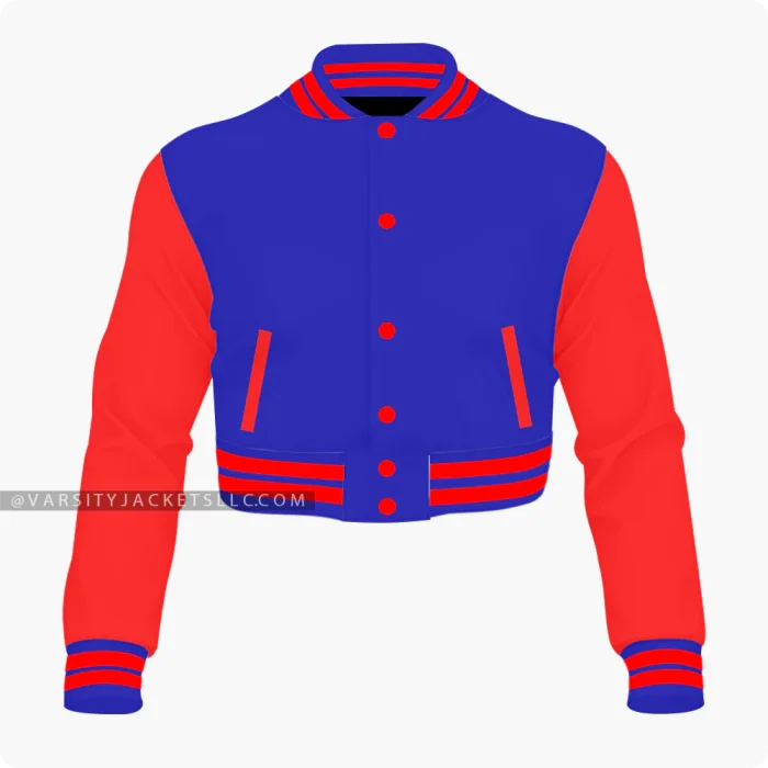 Royal Blue And Red Cropped Varsity Letterman Jacket For Women