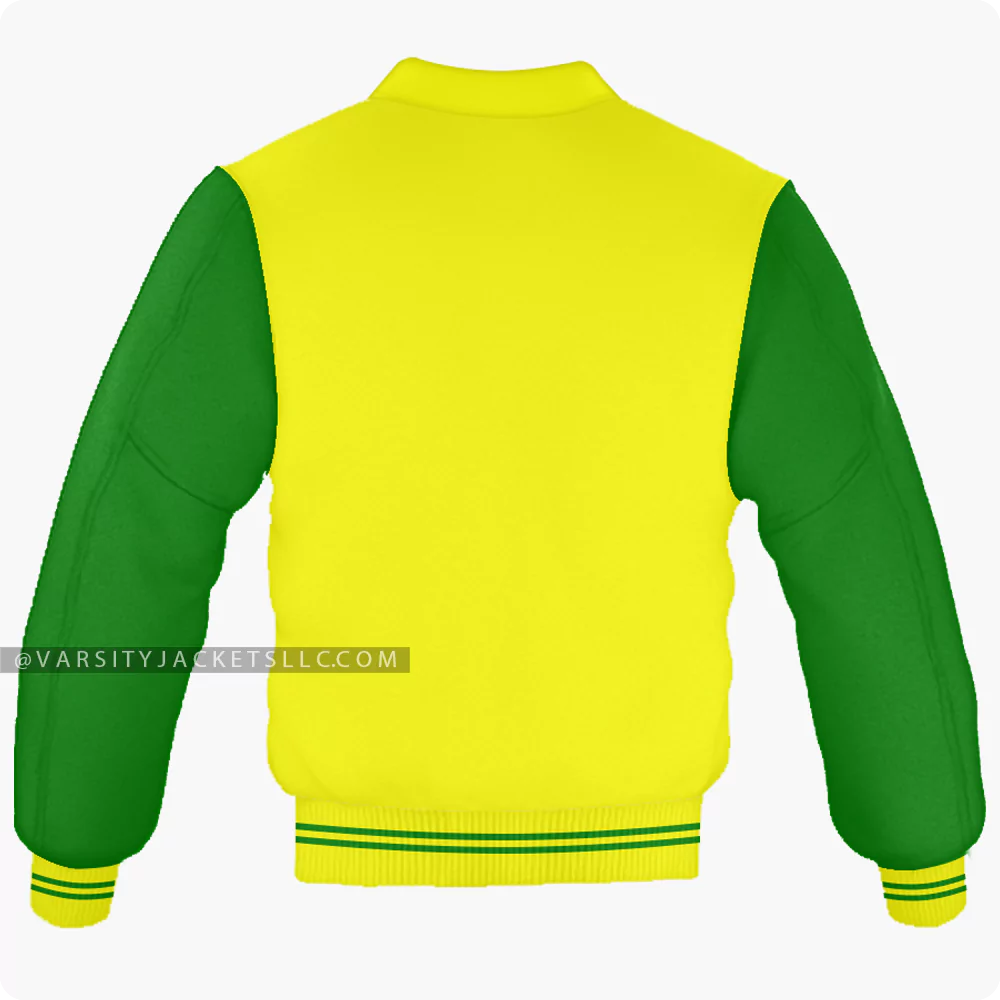 Step into the world where modesty meets functionality with this yellow and green varsity jacket or letterman jacket for men, women and kids! Infuse colors in your wardrobe and get rid of boring dull colors, this green and yellow combo gives athletic vibes. What makes this yellow and green letterman jacket with byron style stand out in the crowd is the fine finishing quality and detailing. It is made from high-quality wool which makes it comfortable and lightweight. Make it a cool jacket by adding customized patches anywhere on it. You can customize the entire look of this men’s and women’s yellow and green varsity jacket or letterman jacket by selecting sleeve color, collar style (hoodie or regular), fabric (satin or leather), and size according to your choice. Let your style speak volumes!
