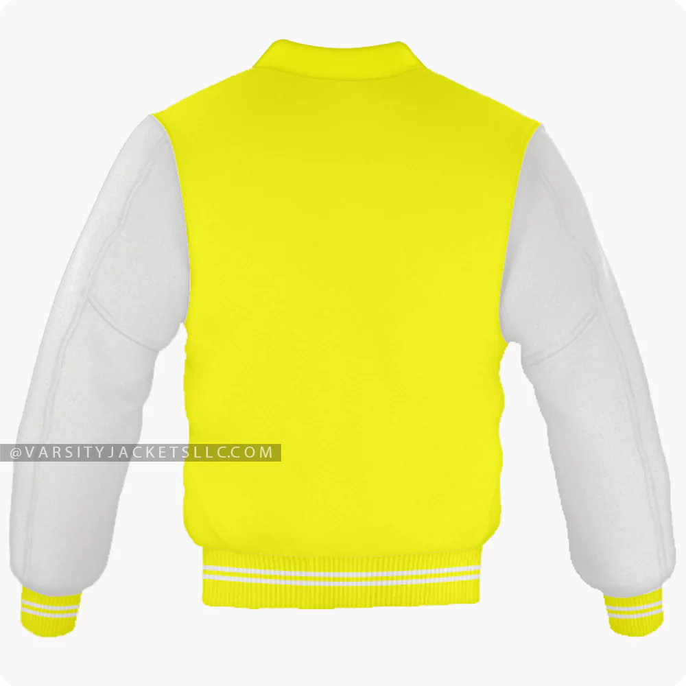 Step into the world where modesty meets functionality with this yellow and off white varsity jacket or letterman jacket for men, women and kids! Infuse colors in your wardrobe and get rid of boring dull colors, this off white and yellow combo gives athletic vibes. What makes this yellow and off white letterman jacket with byron style stand out in the crowd is the fine finishing quality and detailing. It is made from high-quality wool which makes it comfortable and lightweight. Make it a cool jacket by adding customized patches anywhere on it. You can customize the entire look of this men’s and women’s yellow and off white varsity jacket or letterman jacket by selecting sleeve color, collar style (hoodie or regular), fabric (satin or leather), and size according to your choice. Let your style speak volumes!